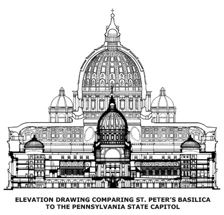 In 1898 Huston and his older brother Samuel departed on an around-the-world tour to see the great art and architecture of Europe. While in Rome, Samuel nearly died when his appendix ruptured. With his brother's recuperation taking weeks, Huston spent his time traveling the city with sketchbook in hand. He made drawings of the art and architecture, in particular St. Peter's Basilica - opens in a new tab, and wrote "one day I hope to build a building as grand…" in one of his notebooks. In 1901 Huston was given the chance to do just that by entering the new Capitol design competition. The European influences, which Huston remembered with extreme vividness, became incorporated into the new building's design. Despite his youth and relative inexperience, the Capitol Building Commission chose Huston as the winner of the 1901 design competition for the new Pennsylvania Capitol. The new Capitol was to be, essentially, a completion of Henry Ives Cobb's brick structure, begun in 1897. From the outset, it was the intention of Huston and the Commission to create a magnificent structure incorporated with a rich program of fine and decorative arts. Huston intended to make the Pennsylvania Capitol a monument to the new Renaissance — an example of architect, painter, and sculptor working together in harmony toward a single goal.